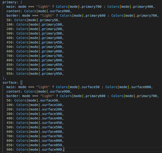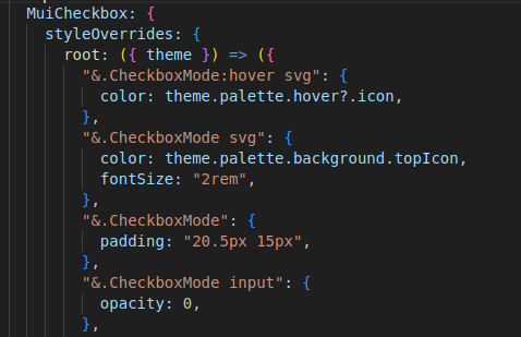 Et grâce à ces variables, palette de couleurs et MaterialUI, je peux styliser les éléments facilement. Par exemple, dans ce code, MuiCheckbox va me cibler toutes les checkbox de l’application. Dans ce cas précis, je rajoute la classe « CheckboxMode » qui est la classe que j’ai ajoutée dans mon composant pour la cibler. Je définis donc ensuite la couleur de l’icône quand elle est dans un certain état ou thème et je définis son style particulier, non défini par défaut par MUI (comme son padding, sa font-size, etc...), toujours dans l’optique de faire comme l’application Bazefield.