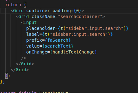 Ensuite, dans mon composant que j’ai créé au préalable. Comme base, j’ai pris un input pour en faire un champ de recherche. Je lui ai affecté un placeholder ainsi qu'un label pour l’affichage du texte en fond « Search ». En préfixe, une icône (loupe), une value qui prendra « searchText », qui est la valeur que va écrire l’utilisateur, et grâce au onChange, je détecte si le texte du input évolue et j’applique la fonction handleModeChange qui va gérer tout le processus de tri sur le menu.