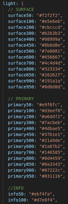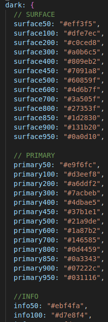 Et enfin je suis passée a la création du nouveau style pour l’application DIP-O en prenant exemple de Bazefield. Pour cela j’ai crée des palettes de couleurs, celles-ci présente dans l’application Bazefield et j’ai crée des variables pour géré les couleurs que prendrais certains éléments en fonction du mode.