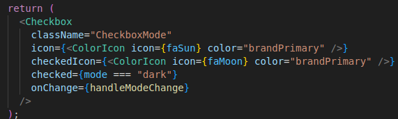 Dans ce code, grâce à MaterialUI, je peux utiliser Checkbox/ et modifier ses propriétés. Dans un premier temps, je lui donne une icône (soleil) quand la checkbox n’est pas cochée (mode light) et je lui ajoute la couleur brandPrimary qui est définie dans mon fichier de thème. Ensuite, je définis son icône (lune) quand la checkbox est cochée (mode dark), et de même je lui donne la couleur brandPrimary. Ensuite, je dis que quand la checkbox est cochée, le mode du thème doit être dark. Et finalement, grâce au onChange, je détecte si la checkbox change d’état et j’applique la fonction handleModeChange qui va géré tout le processus de changement de style sur l’application.