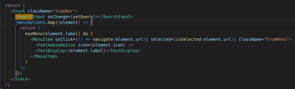 Un autre composant devait être ajouté à l’application DIP-O, il s’agit d’un SearchInput dans le menu de navigation pour trier le menu. Pour cela, dans mon composant SideBar, j’ajoute à l’endroit voulu le SearchInput avec, en option, le onChange.